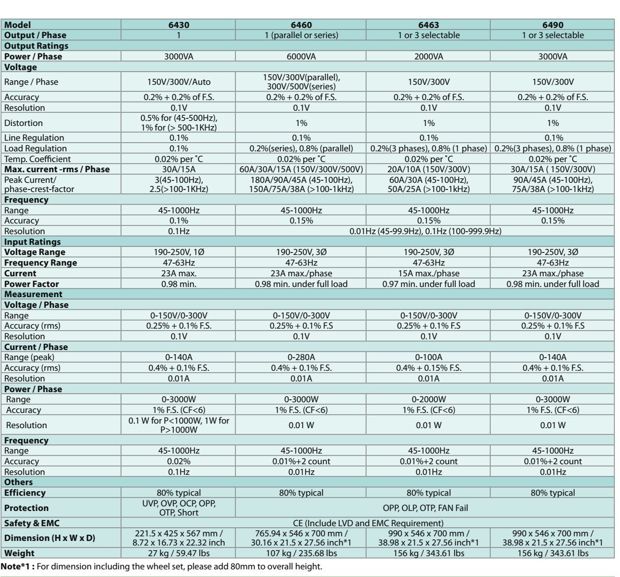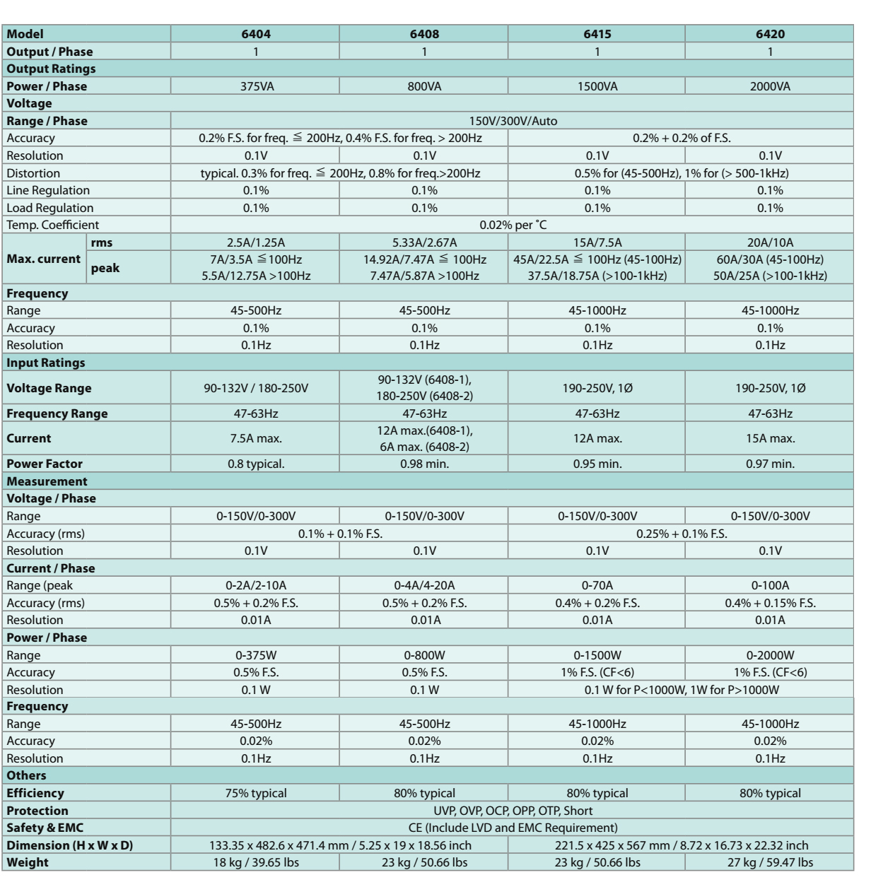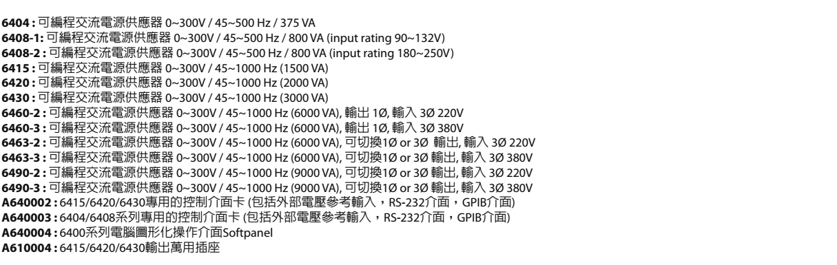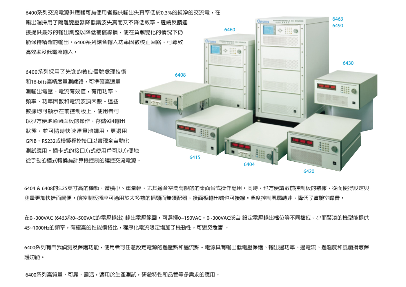 Chroma 6400系列连用了目前国际先进PWM技术,而设计制造出的高性能价格比的可编程交流电源供应器。能以优异的价格提供纯净的交流电源。 6400可提供踊岀电屋在0-300V之间,频率在45~1*Hz之间变化的交流电源。它不仅可满足-般商业(47-63HZ)的需求,更适用于航至、军事的40QHZ交流电源测试的陋用。 6400系列产品均可IS出非常纯净的交流髦,它具有失真度低于03%以下隈异特性。 6400系列产品采用了先进的功率因数补偿电路•从而达到提升辅入瞩功率因集至0.98以上,符合IEC规范。 6400系列产品内采用先进的高精密DSP测童线路,可为用户提供高精度,高速度的毛压有效S、电流有效値、功率、第率' 功率因数及I®値系数等输出参数。 透过前面板的LCD顕示器及旋钮,即可在63000系列电子负载上做衙易的操作与设定,更能透过Ethernet ' USB和GPIB等介面进行远端有线或无线的控制。 6400系列产品很容易操作•可为用户提供前面板操作,也可提供迩方程控的模梃控制信号操作•也可通过GPIB ' RS-232标准介面控制产品的状态o GPIB ' RS-232榇准接口可使得仪器易于整合在各种自勤测试设儒上。 6400系列产品具有自我诊断程序设计及过压、过功率、过电流、过淙度或风98失灵等自我保护绿路。使其成为适于各种需求的可信赖的产品。更完全符合设计开发、生产线测试及品保的产品检测的需求。