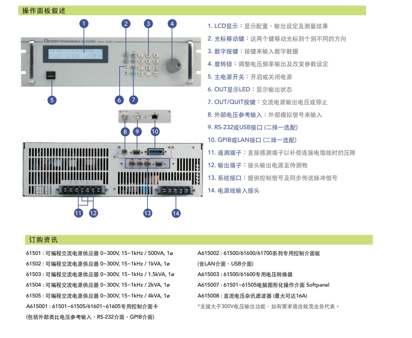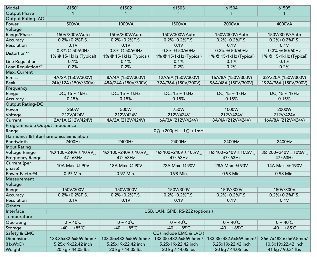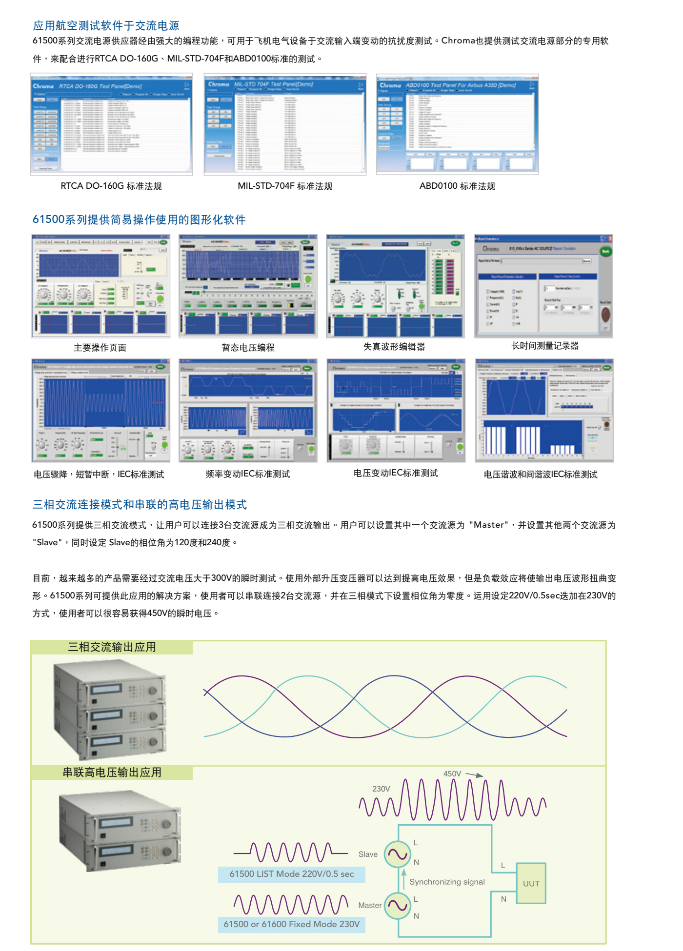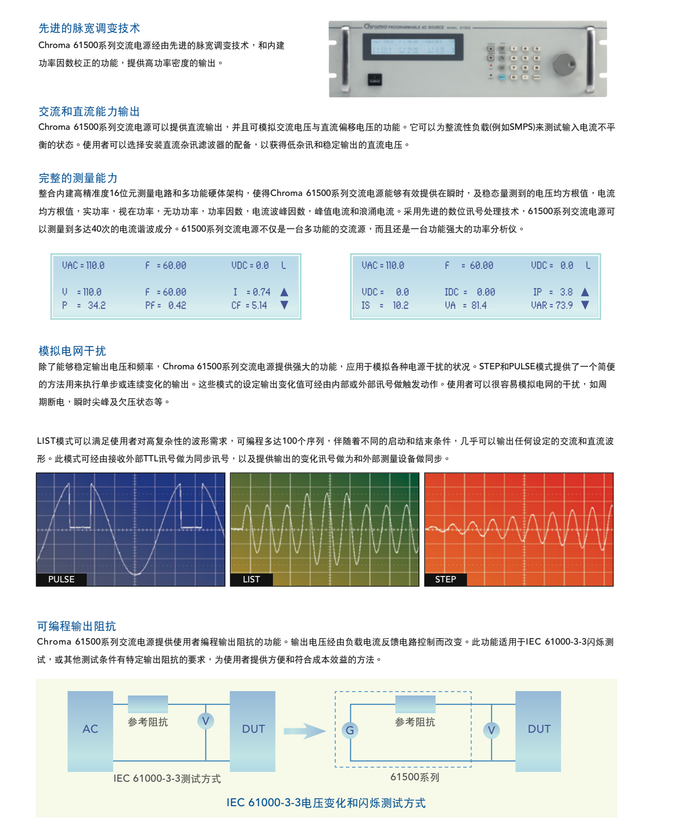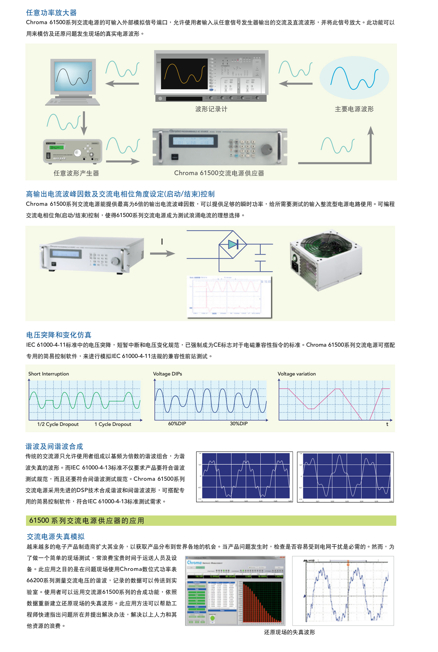 Chroma 61500系列交流电源供应器,树立了业界高性能AC电源产品的新标准。此系列产品可提供强大的使用功能,如电网干扰模拟,可编程输出阻抗,全方位的测最功能,合成波形与IEC标准测试软件。因拥有以上特点使得61500系列适合应用于一般商业产品,电力电子,航空电子设备,军事与IEC标准测试的开发和运用,并且从实验桌上测试到大量生产单位皆可适用。 本系列提供使用者不同容最的单相输出产品,从500VA到4000VA。不论是在研发设计,产品验证或量产测试等,都有最完善的应用选择。 全61500系列产品使用最先进的脉宽调变技术,使其能输出多达6倍最大额定电流峰值的能力,使得61500系列成为测试浪涌电流的最佳选择。 透不仅提供纯交流电压应用,AC+DC模式还扩展功能提供直流偏移电压的应用。 61500系列运用先进的数位讯号处理技术(DSP),能够提供高精度和瞬时电压波形测最,如电压均方根值,电流均方根值,实功率,功率因数,电流波峰因数以及最测多达40次的电流谐波成份。 61500系列提供使用者组合不同谐波成份的功能,为合成谐波失真波的形状。另外还提供了一个可输入外部类比信号端口,可从任意信号产生器产生模拟信号,并将此信号放大以模仿实际观察到的波形。 经由多功能的可编程波形设定和使用方便的操作软件,61500系列交流电源供应器让使用者能够完成符合IEC 61000-4-11 (法规前测)/413/-4-14/-4-28的标准抗扰度测试。低阻抗和低电压的谐波特性使得61505成为符IEC 61000-3-2标准的最佳选择。另外可程式化的输出阻抗,如再搭配闪烁员测仪器,便可«IEC61000-3-3的标准测试。