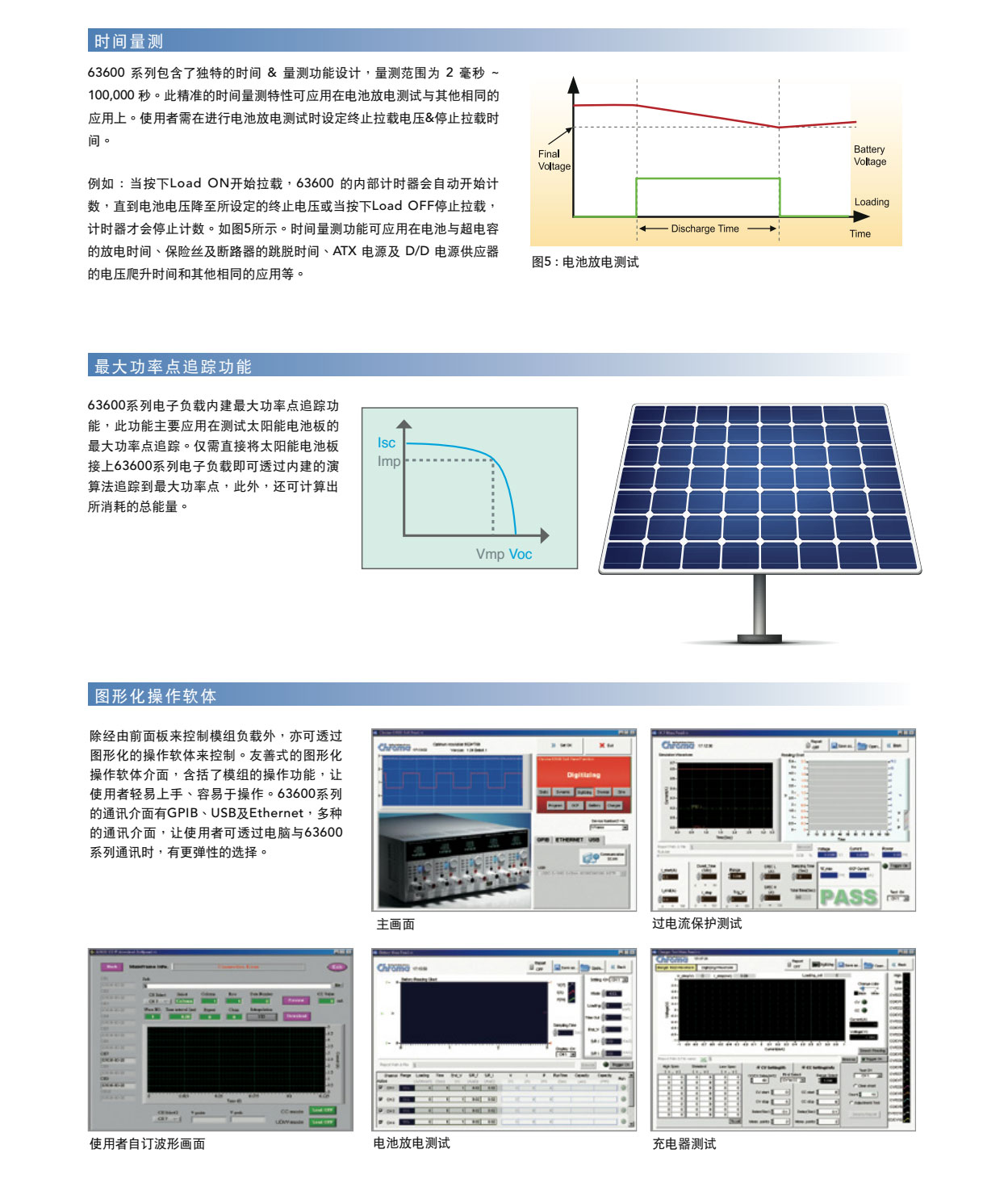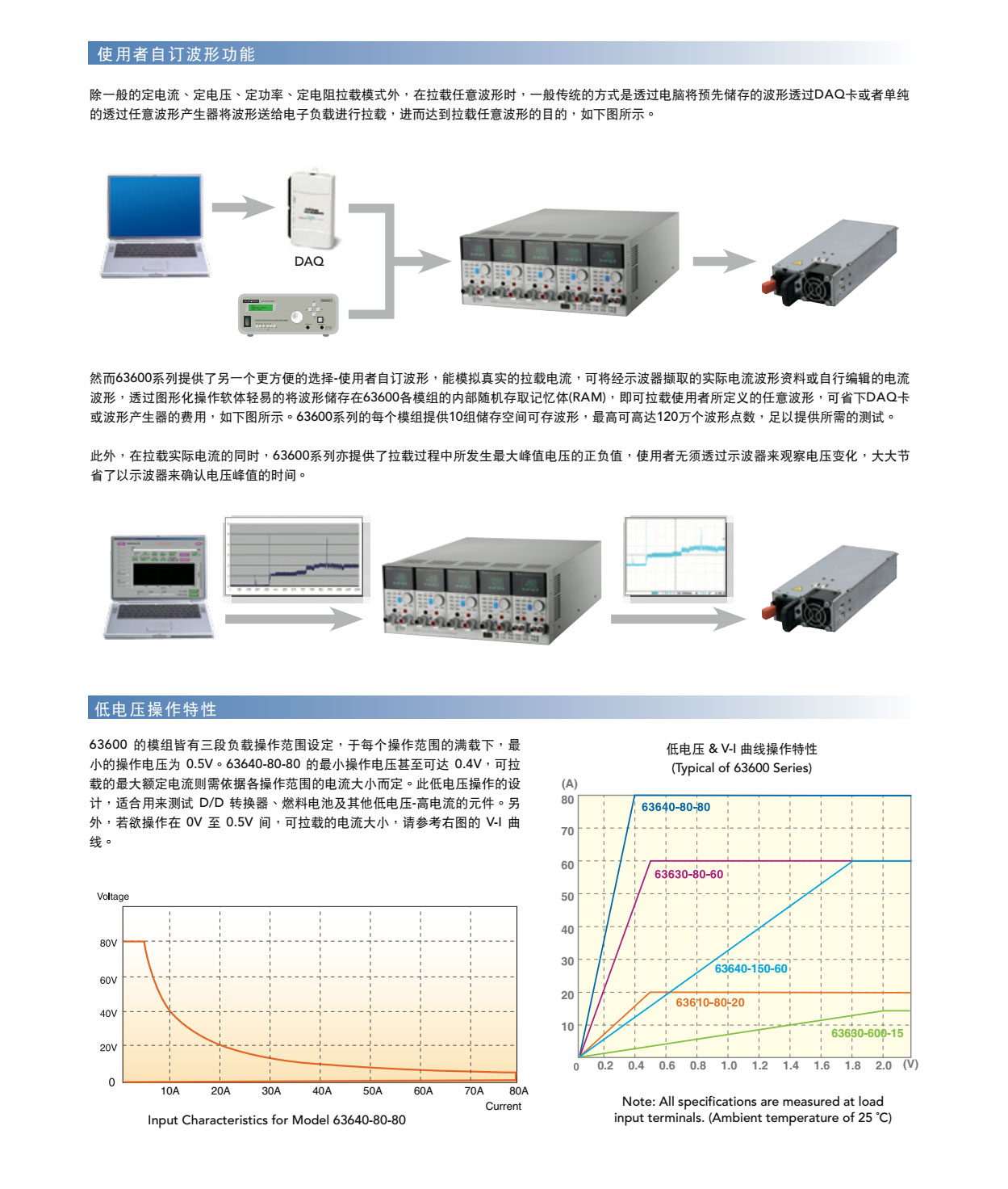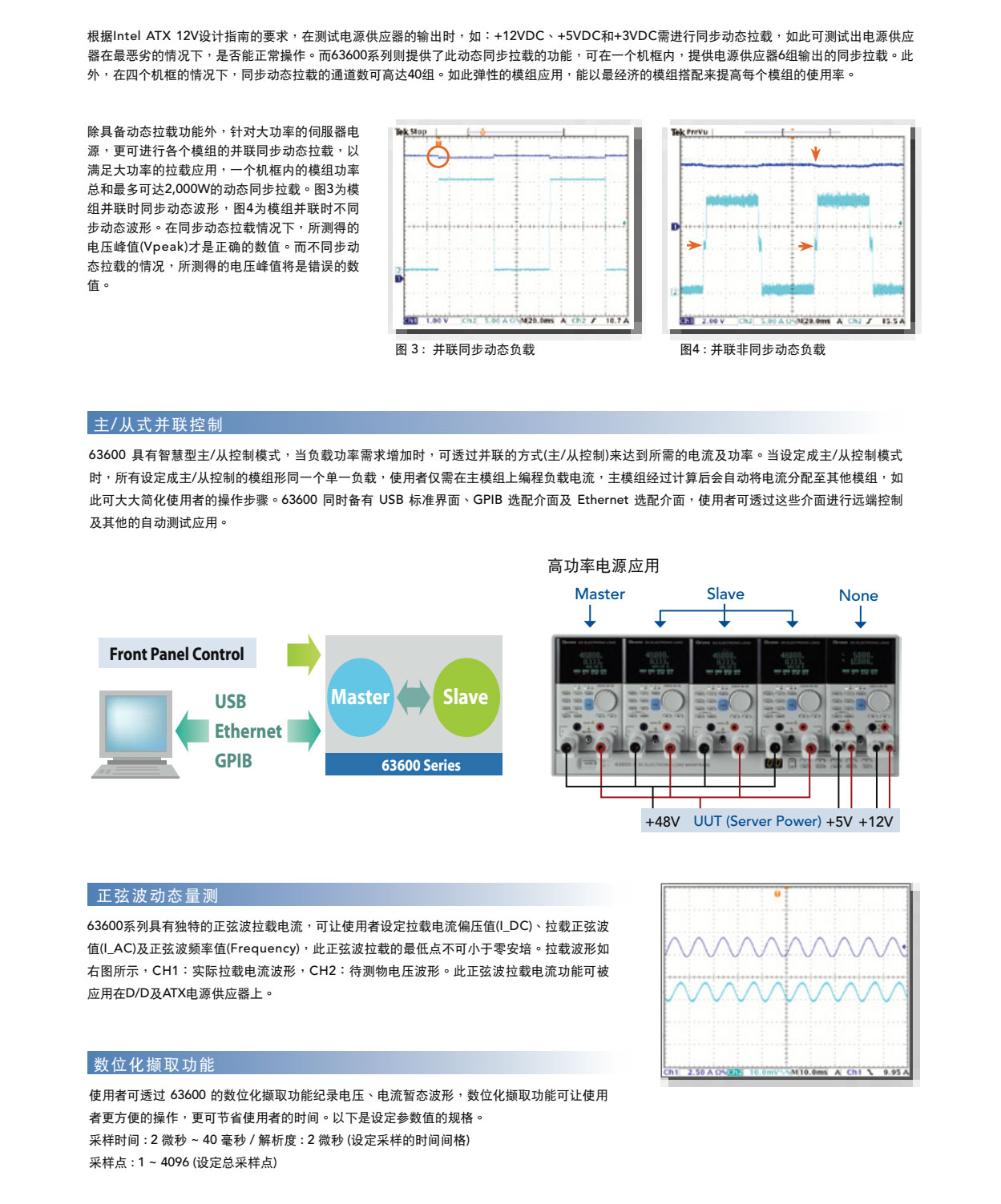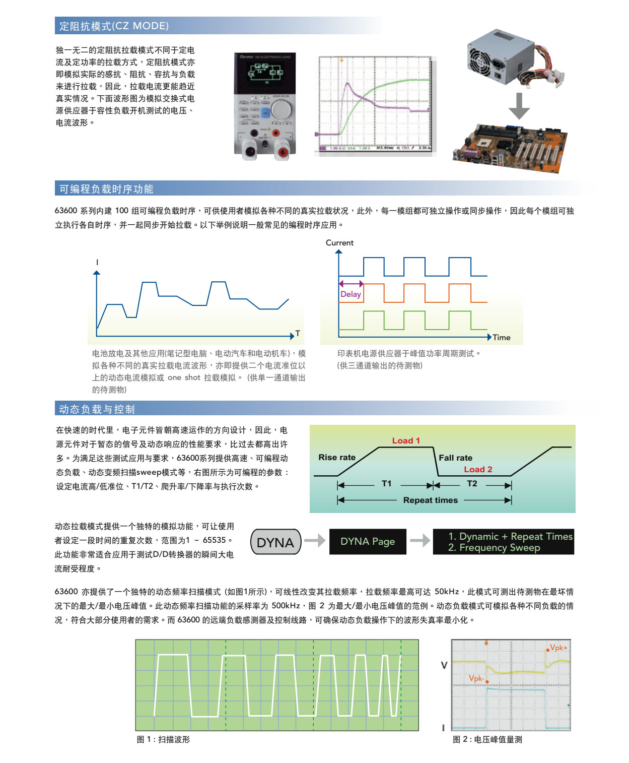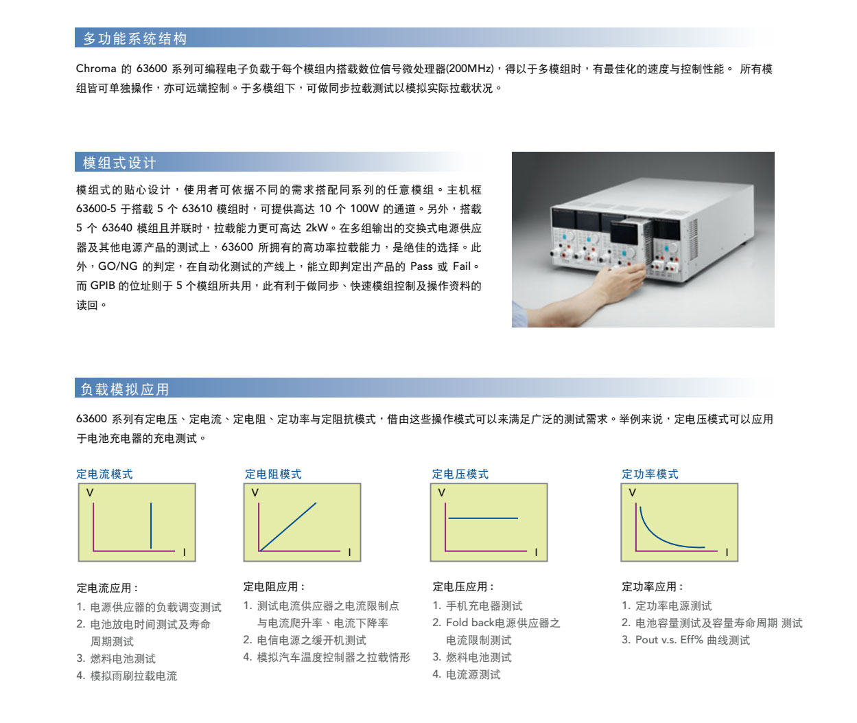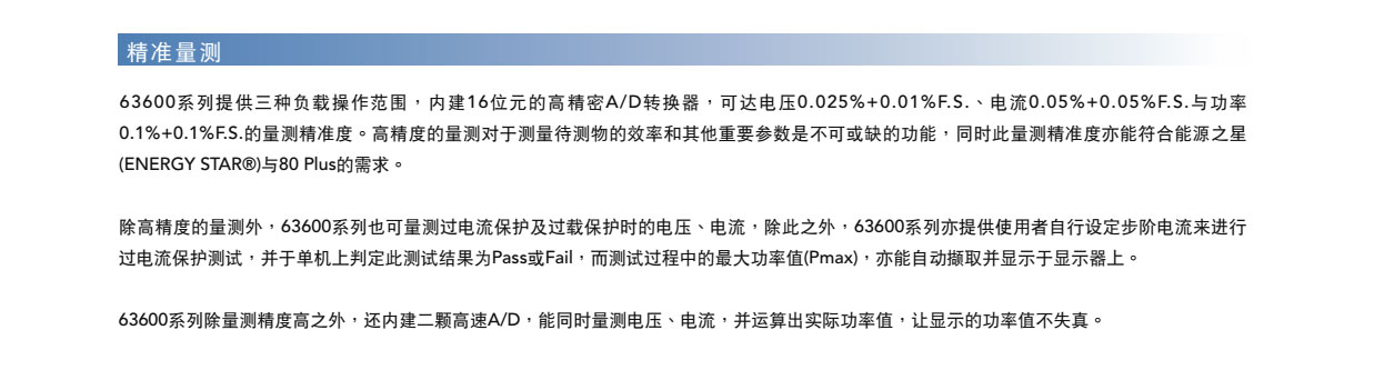 63600系列直流电子负载,主要是供A/D电源供应器' D/D转换器、充电器、电池、伺服器电源及一些电力电子元件等产品测试使用,另外,对于研发部门、产品屋产及一些进料检验的应用等,63600都能展现其优异的性能。 63600运用DSP的新技术开发了首创的定阻抗(CZ)操作模式,此模式可模拟非线性负载的实际拉载状况。 63600系列可在低电压(0.4V)下拉载其额定电流。此特性于Point-of-Load的D/D测试及燃料电池的测试上,仍保有其最佳的拉载能力。 63600系列可透过可编程的拉载电流准位 ' 电流爬升率/下降率、持续时间和Von点电压等功能来模拟广泛的动态负载应用。63600也有自动变频动态扫瞄功能(亦即不同频率的负载模拟)以满足ATX电源供应器的需求。再者,亦提供了100组的储存功能,并可随时呼叫使用者所储存的设定值。在自动化的测试上,此储存、呼叫的功能可缩短测试时间。 63600整合了即时精准的电压、电流量测功能,每个模组都具有三个档位、解析度高达16位元。使用者可于线上做即时的电压量测和调整,也可使用前面板上的按键进行短路模拟测试。 透过前面板的VFD显示器及旋钮,即可在63600系列电子负载上做简易的操作与设定,更能透过Ethernet、USB和GPIB等介面进行远端控制。 63600也包含了例行性自我诊断功能及过功率、过电流、过温度的保护与过电压告警,此外还提供了正负极反接的告警,此全方位的保护功能,更能确保63600系列的品质与可靠度。
