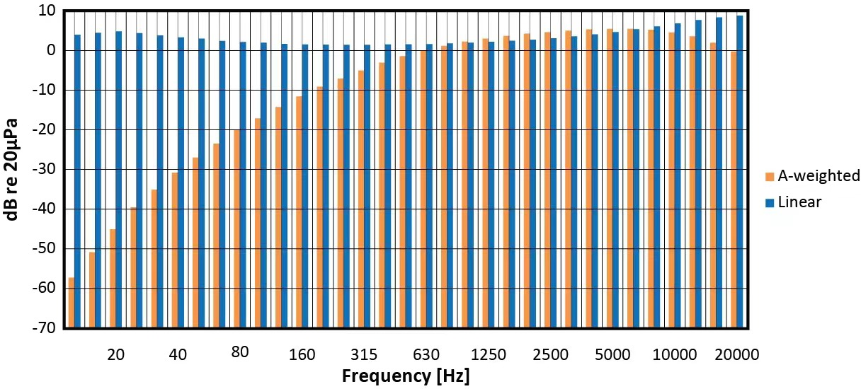 以dB为特征的典型噪声地板以1/3八度波段显示——线性和A加权。
